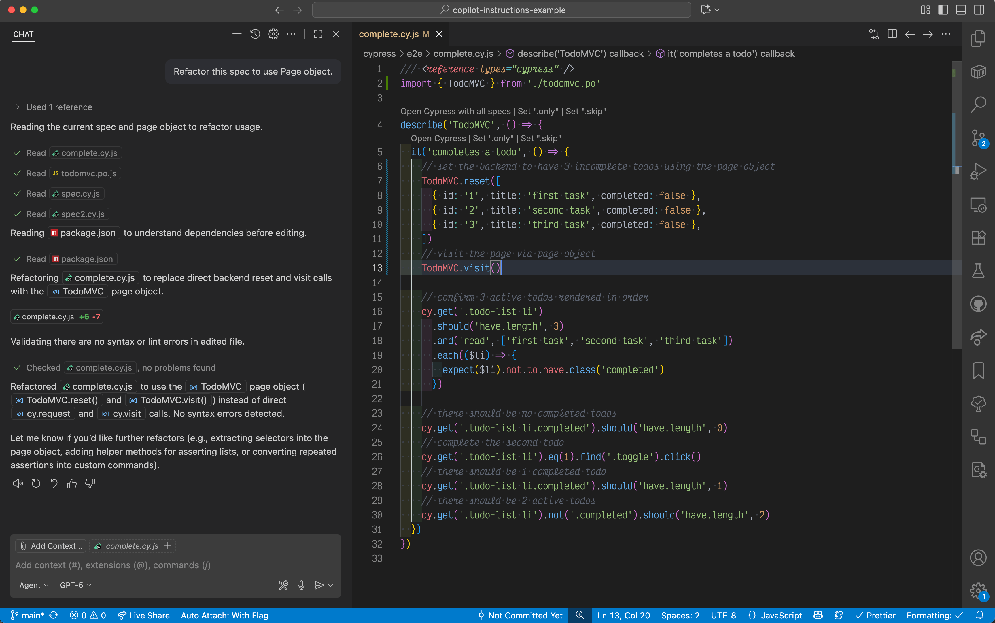 I have described using Use Copilot Instructions And Page Objects to quickly develop end-to-end Cypress tests. This blog post gives another concrete example. You can find the source code in the repo bahmutov/copilot-instructions-example. First, I wrote a page object file to implement common TodoMVC application test commands: